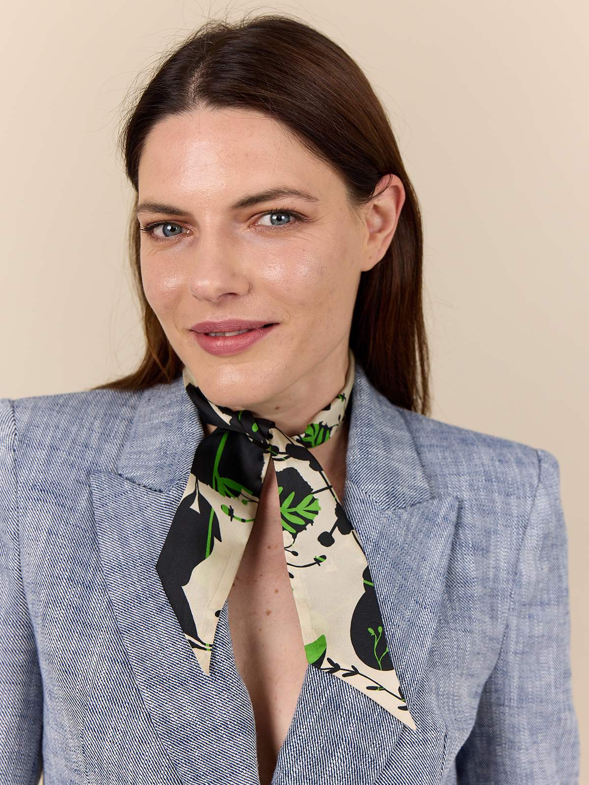 Smalt, aflangt silketørklæde med smukke blomstre prints. Du kan bruge tørklædet ved at lave en sløjfe om halsen eller i håret.